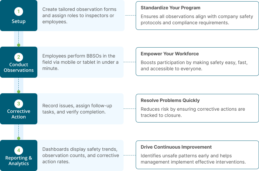 This process involves not just observation but also engaging with employees, providing feedback, and educating them on safe practices. The BBS program is a collaborative effort, encouraging participation from all levels of the organization to foster a culture of safety awareness and continuous improvement in workplace safety standards.